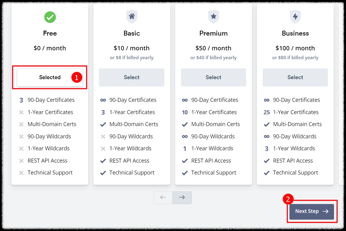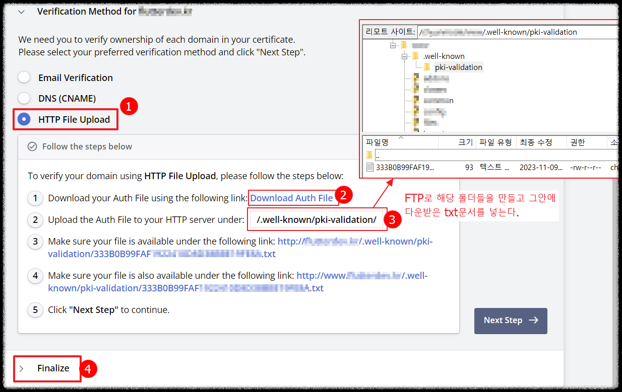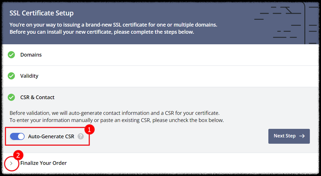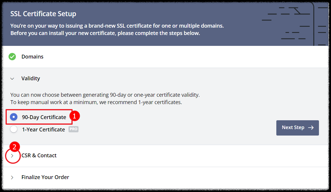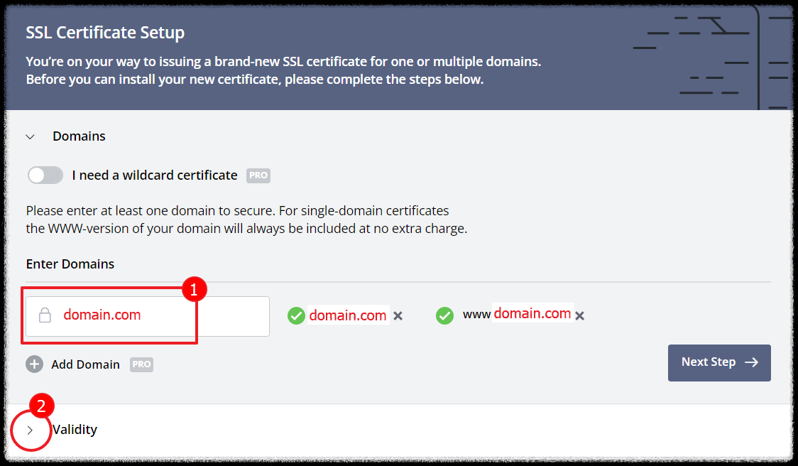 SSL적용할 도메인을 입력후 Next Step버튼을 클릭합니다.