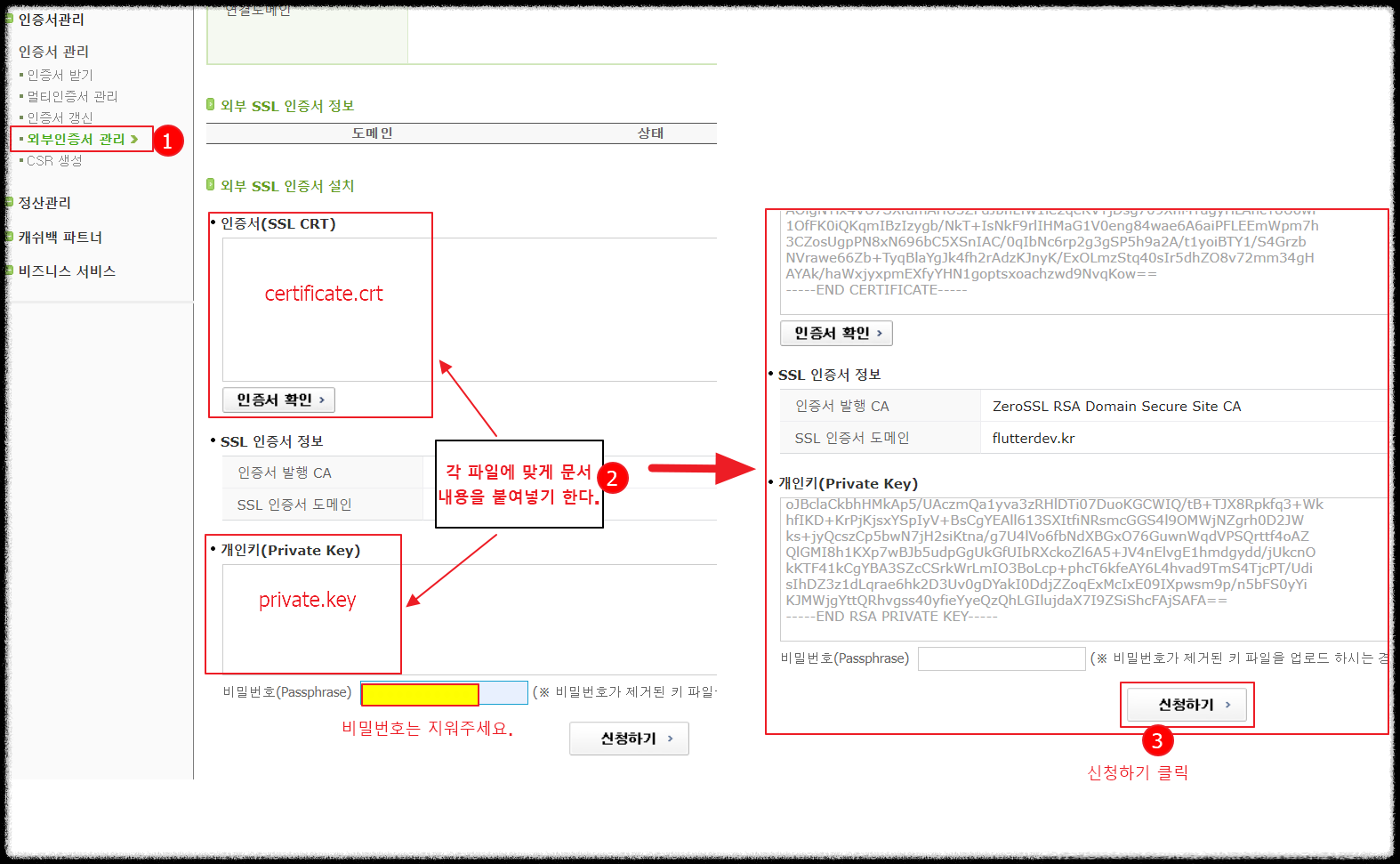 인증서란과 개인키란에 앞서 문서편집툴로 열어놨던 내용들을 모두 붙여넣습니다.