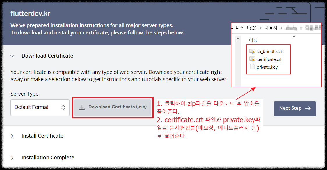 그리고 안에 들어있는 certificate.crt파일과 private.key파일을 문서편집툴로 열어줍니다.