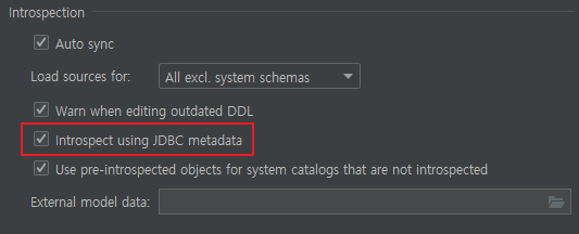 Properties Or Data Sourceds and Drivers > 해당DB > Options > Introspection에서